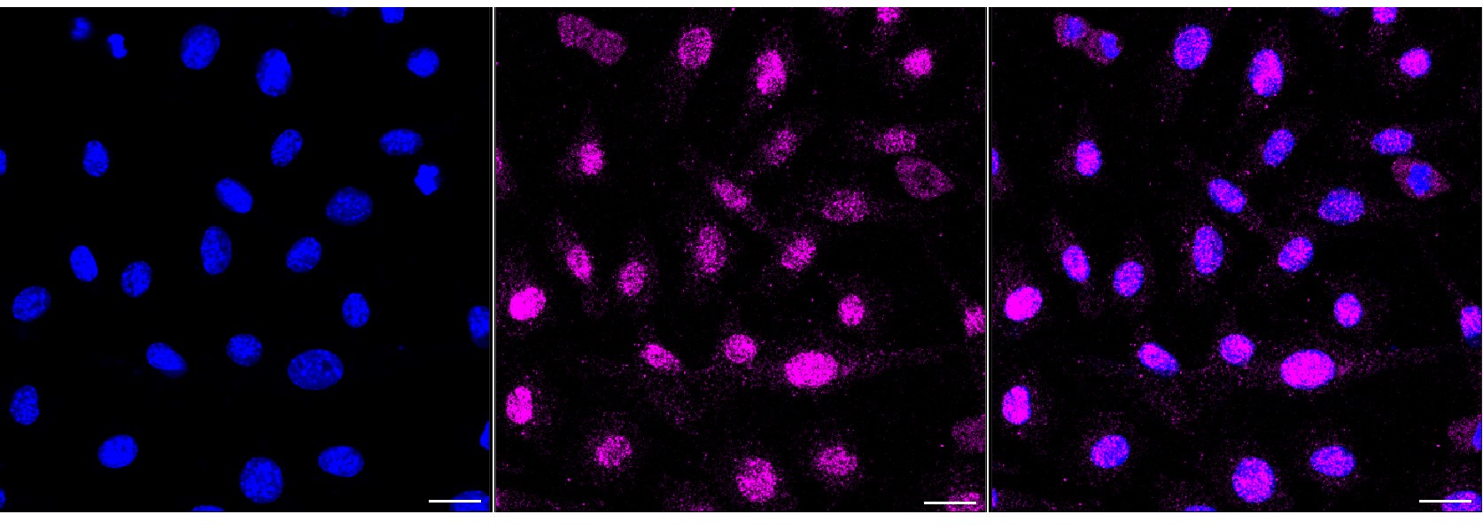Immunocytochemical staining of C2C12 cells with ABHD5 antibody. Nuclei were stained blue with DAPI; ABHD5 was stained magenta with Alexa Fluor? 647. Images were taken using Leica stellaris 5. Protein abundance based on laser Intensity and smart gain: Low. Scale bar, 20 μm.
