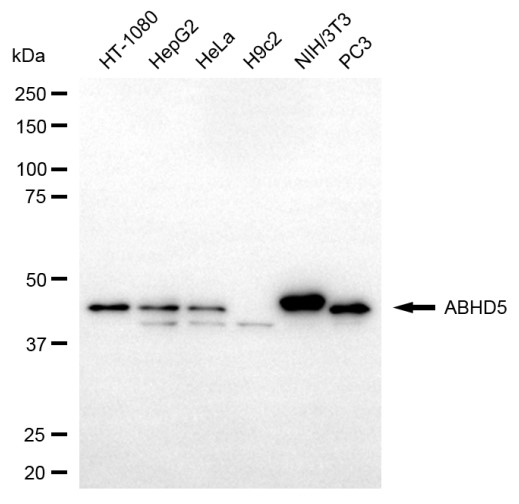 Western blotting analysis using ABHD5 antibody. Total cell lysates (30 μg) from various cell lines were loaded and separated by SDS-PAGE. The blot was incubated with ABHD5 antibody and HRP-conjugated goat anti-rabbit secondary antibody respectively.