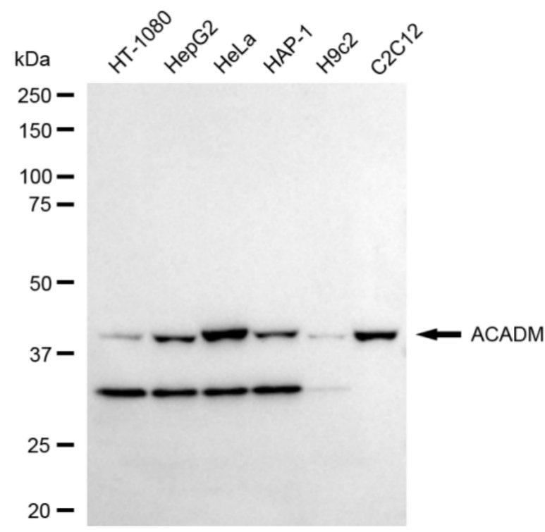 Western blotting analysis using ACADM antibody. Total cell lysates (30 μg) from various cell lines were loaded and separated by SDS-PAGE. The blot was incubated with ACADM antibody and HRP-conjugated goat anti-rabbit secondary antibody respectively.