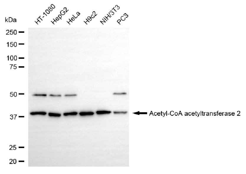 Western blotting analysis using acetyl-CoA acetyltransferase 2 antibody. Total cell lysates (30 μg) from various cell lines were loaded and separated by SDS-PAGE. The blot was incubated with acetyl-CoA acetyltransferase 2 antibody and HRP-conjugated goat anti-rabbit secondary antibody respectively.