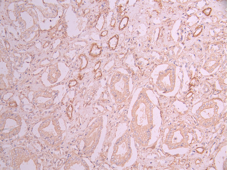 IHC image of CSB-RA163563A0HU diluted at 1:100 and staining in paraffin-embedded human kidney tissue performed on a Leica BondTM system. After dewaxing and hydration, antigen retrieval was mediated by high pressure in a citrate buffer (pH 6.0). Section was blocked with 10% normal goat serum 30min at RT. Then primary antibody (1% BSA) was incubated at 4°C overnight. The primary is detected by a Goat anti-rabbit polymer IgG labeled by HRP and visualized using 0.05% DAB.