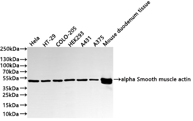 Positive WB detected in: Hela whole cell lysate(30μg), HT-29 whole cell lysate(30μg), COLO-205 whole cell lysate(30μg), HEK293 whole cell lysate(30μg), A431 whole cell lysate(30μg), A375 whole cell lysate(30μg), Mouse duodenum tissue lysate(30μg)