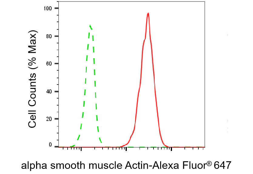 Flow cytometric analysis of alpha smooth muscle Actin expression in C2C12 cells using alphasmoothmuscleActin antibody. Green, isotype control; red, alpha smooth muscle Actin.