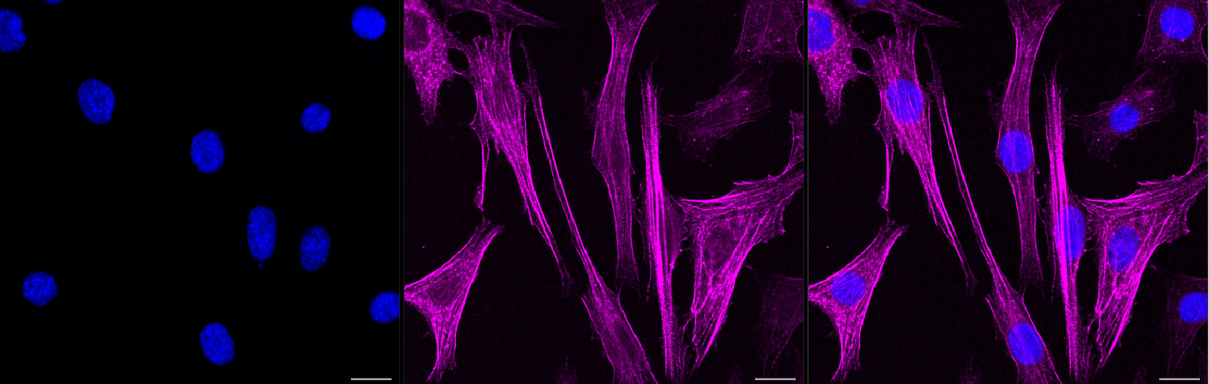 Immunocytochemical staining of C2C12 cells with alpha smooth muscle Actin antibody. Nuclei were stained blue with DAPI; alpha smooth muscle Actin was stained magenta with Alexa Fluor? 647. Images were taken using Leica stellaris 5. Protein abundance based on laser Intensity and smart gain: Medium. Scale bar, 20 μm.