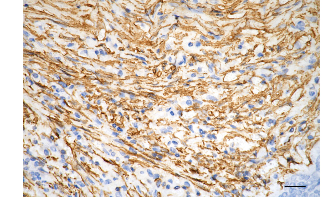 Immunohistochemistry was performed on paraffin-embedded human sigmoid colon carcinoma using alpha smooth muscle actin antibody. Antigen retrieval was done in sodium citrate buffer (pH 6.0). DAB was used for detection, with hematoxylin counterstaining. Images were acquired using a Nikon Ci-L Plus microscope (40× objective). Scale bar: 25 μm.
