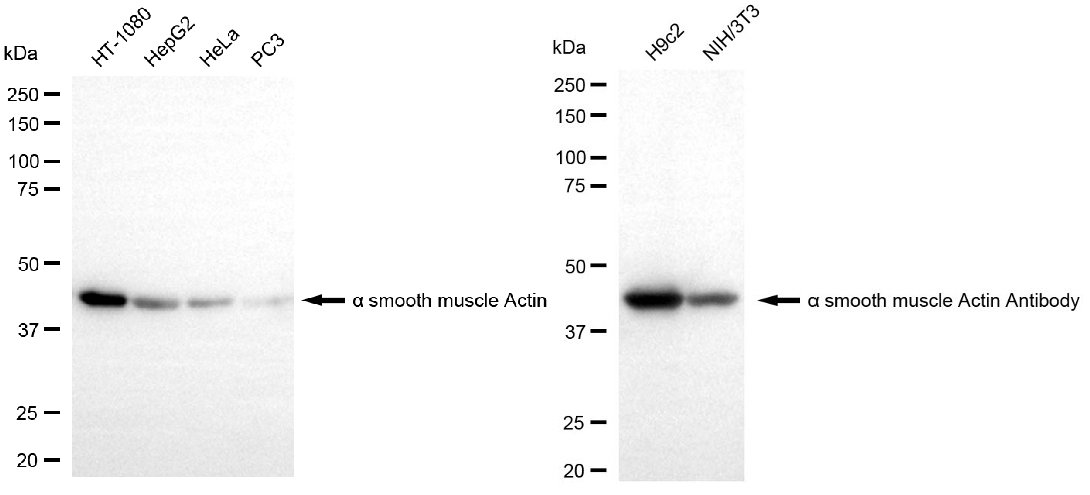 Western blotting analysis using alpha smooth muscle Actin antibody. Total cell lysates (30 μg) from various cell lines were loaded and separated by SDS-PAGE. The blot was incubated with alpha smooth muscle Actin antibody and HRP-conjugated goat anti-rabbit secondary antibody respectively.
