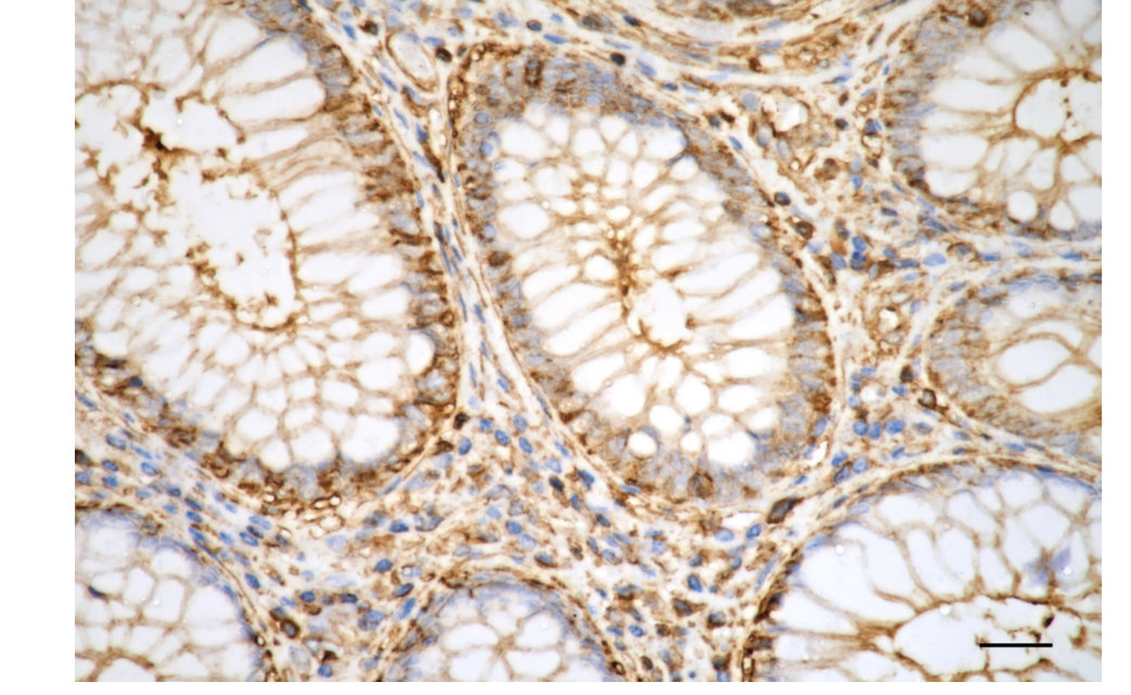 Immunohistochemistry was performed on paraffin-embedded human sigmoid colon carcinoma using alpha smooth muscle actin antibody. Antigen retrieval was done in sodium citrate buffer (pH 6.0). DAB was used for detection, with hematoxylin counterstaining. Images were acquired using a Nikon Ci-L Plus microscope (40× objective). Scale bar: 25 μm.