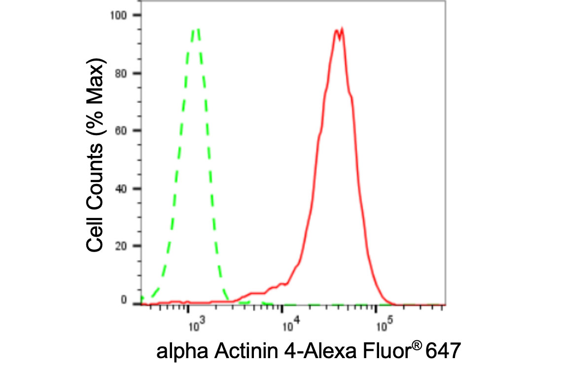 Flow cytometric analysis of alpha Actinin 4 expression in HepG2 cells using alpha Actinin 4 antibody. Green, isotype control; red, alpha Actinin 4.