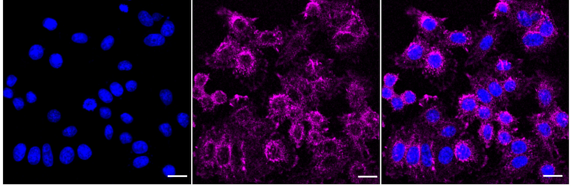 Immunocytochemical staining of HepG2 cells with alpha Actinin 4 antibody. Nuclei were stained blue with DAPI; alpha Actinin 4 was stained magenta with Alexa Fluor? 647. Images were taken using Leica stellaris 5. Protein abundance based on laser Intensity and smart gain: Medium. Scale bar: 20 μm.