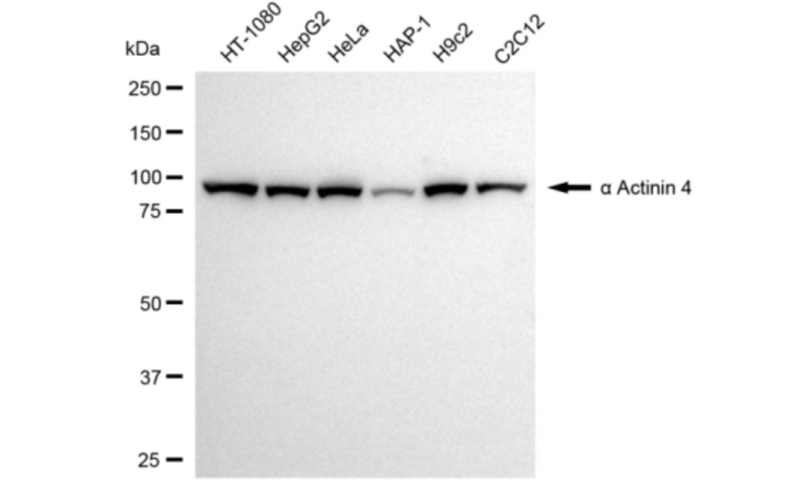 Western blotting analysis using alpha Actinin 4 antibody. Total cell lysates (30 μg) from various cell lines were loaded and separated by SDS-PAGE. The blot was incubated with alpha Actinin 4 antibody and HRP-conjugated goat anti-rabbit secondary antibody respectively.