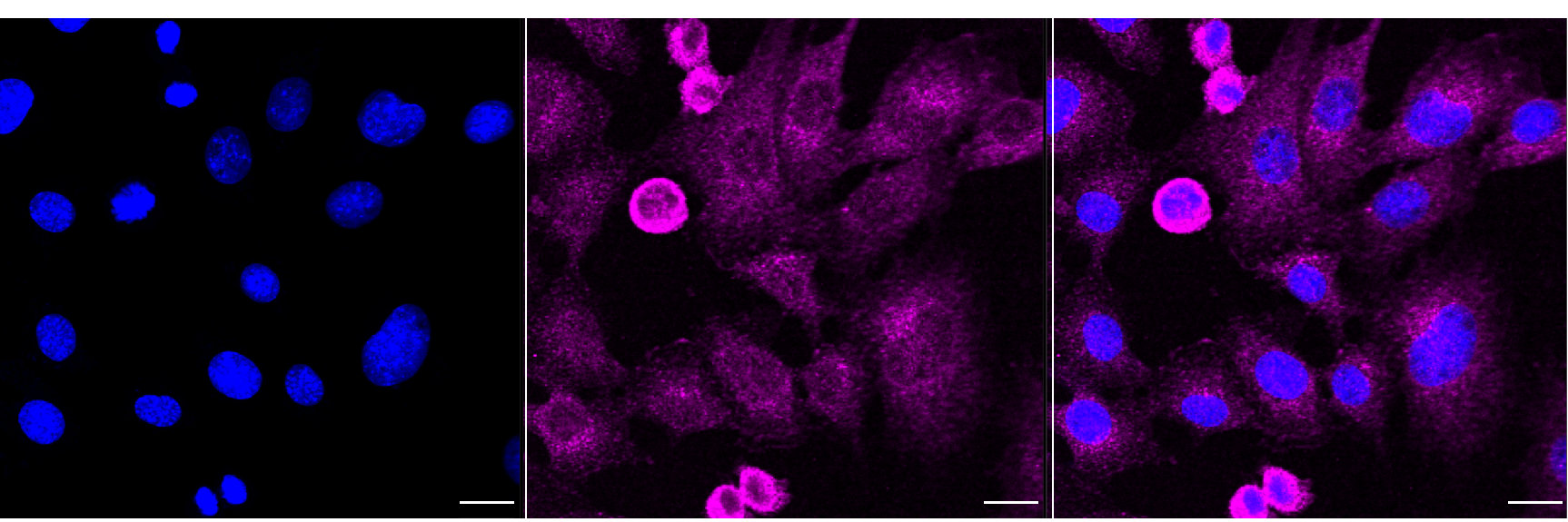 Immunocytochemical staining of C2C12 cells with Arp3 antibody. Nuclei were stained blue with DAPI; Arp3 was stained magenta with Alexa Fluor? 647. Images were taken using Leica stellaris 5. Protein abundance based on laser Intensity and smart gain: Low. Scale bar, 20 μm.
