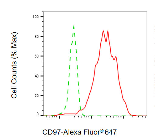 Flow cytometric analysis of CD97 expression in HepG2 cells using CD97 antibody. Green, isotype control; red, CD97.