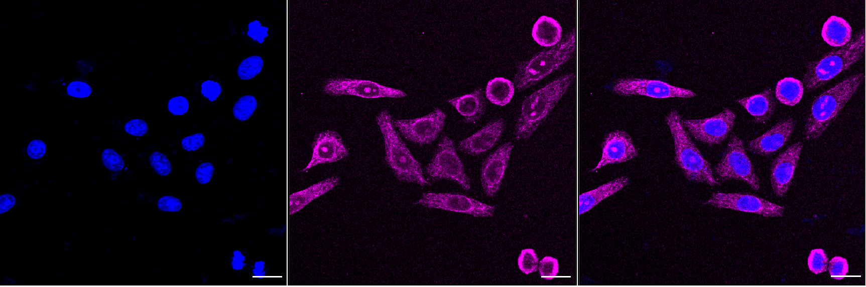 Immunocytochemical staining of HepG2 cells with CD97 antibody. Nuclei were stained blue with DAPI; CD97 was stained magenta with Alexa Fluor? 647. Images were taken using Leica stellaris 5. Protein abundance based on laser Intensity and smart gain: Medium. Scale bar, 20 μm.