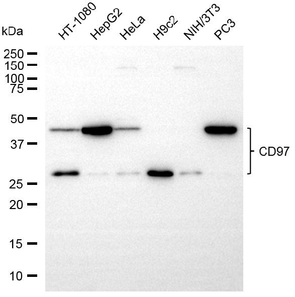 Western blotting analysis using CD97 antibody. Total cell lysates (30 μg) from various cell lines were loaded and separated by SDS-PAGE. The blot was incubated with CD97 antibody and HRP-conjugated goat anti-rabbit secondary antibody respectively.