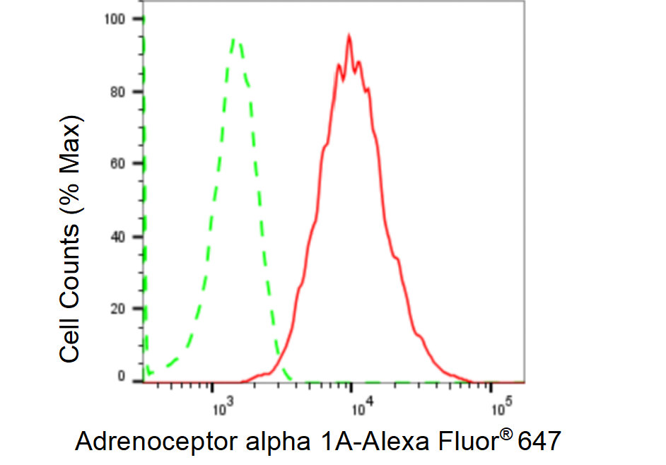 Flow cytometric analysis of Adrenoceptor alpha 1A expression in HepG2 cells using Adrenoceptor alpha 1A antibody. Green, isotype control; red, Adrenoceptor alpha 1A.