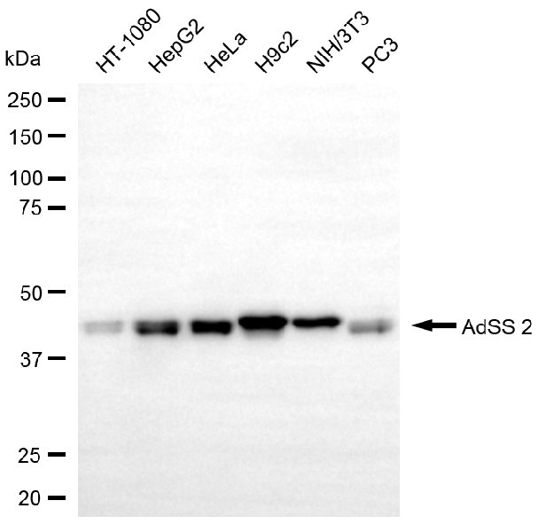 Western blotting analysis using AdSS 2 antibody. Total cell lysates (30 μg) from various cell lines were loaded and separated by SDS-PAGE. The blot was incubated with AdSS 2 antibody and HRP-conjugated goat anti-rabbit secondary antibody respectively.