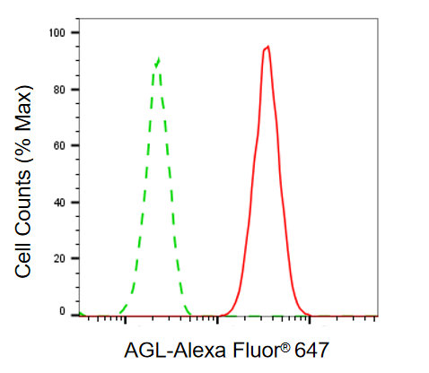 Flow cytometric analysis of AGL expression in HAP-1 cells using AGL antibody. Green, isotype control; red, AGL.