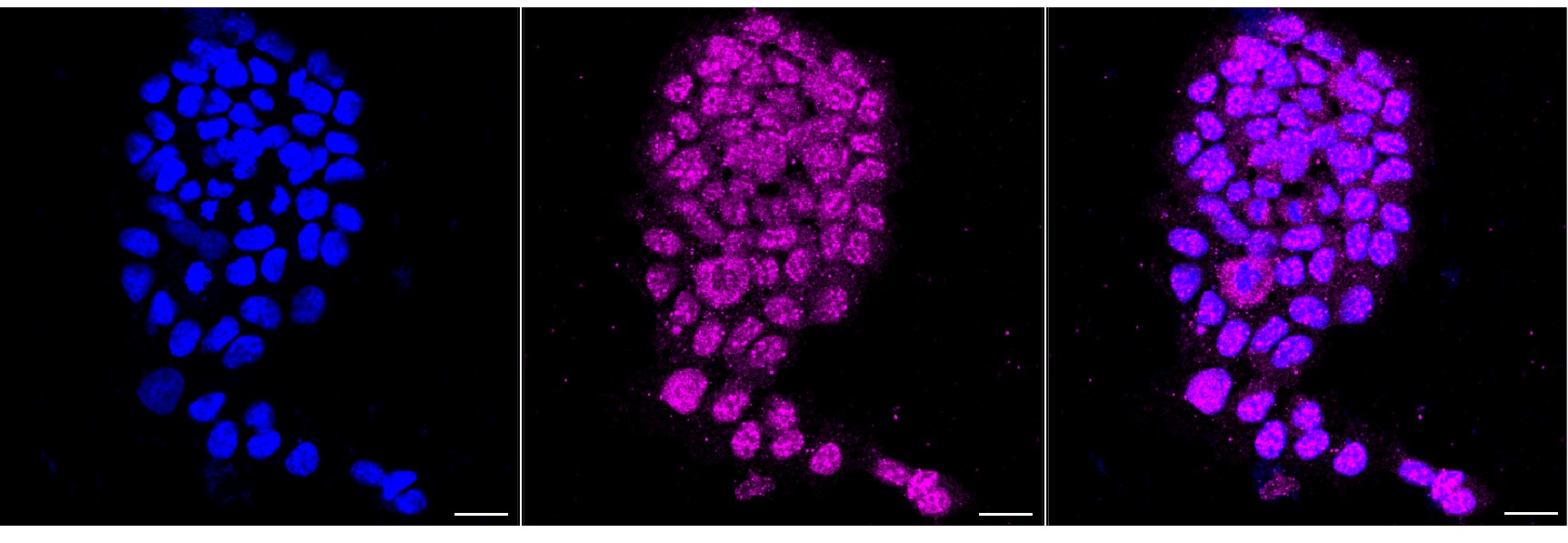 Immunocytochemical staining of HAP-1 cells with AGL antibody. Nuclei were stained blue with DAPI; AGL was stained magenta with Alexa Fluor? 647. Images were taken using Leica stellaris 5. Protein abundance based on laser Intensity and smart gain: Medium. Scale bar, 20 μm.