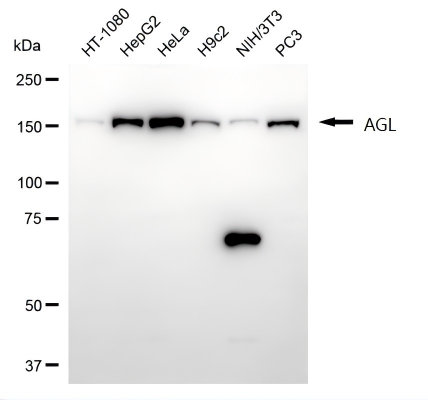 Western blotting analysis using AGL antibody. Total cell lysates (30 μg) from various cell lines were loaded and separated by SDS-PAGE. The blot was incubated with AGL antibody and HRP-conjugated goat anti-rabbit secondary antibody respectively.