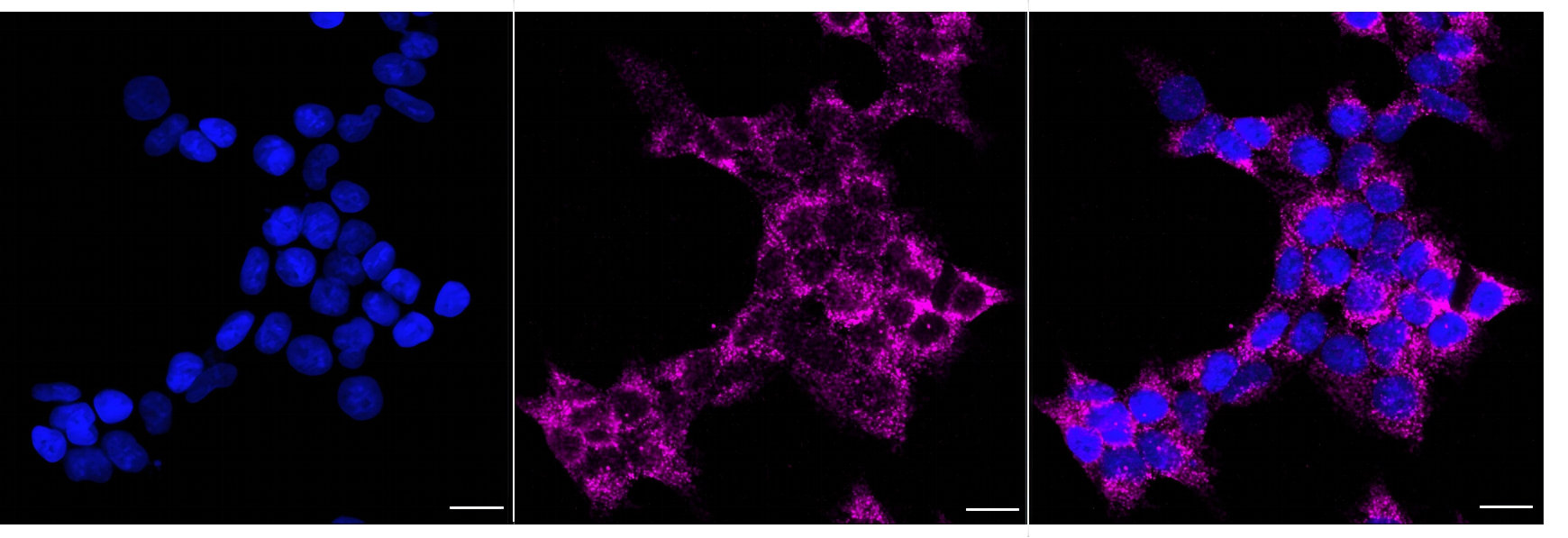 Immunocytochemical staining of Hela cells with Alkylglycerone phosphate synthase antibody. Nuclei were stained blue with DAPI; Alkylglycerone phosphate synthase was stained magenta with Alexa Fluor? 647. Images were taken using Leica stellaris 5. Protein abundance based on laser Intensity and smart gain: Low. Scale bar, 20 μm.