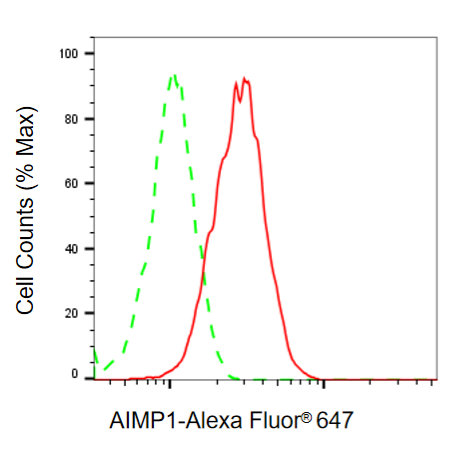 Flow cytometric analysis of AIMP1 expression in HT-1080 cells using AIMP1 antibody. Green, isotype control; red, AIMP1.