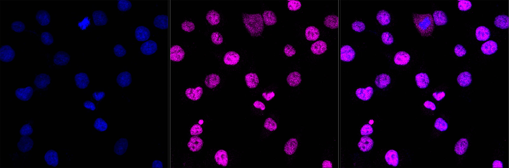 Immunocytochemical staining of HT-1080 cells with AIMP1 antibody. Nuclei were stained blue with DAPI; AIMP1was stained magenta with Alexa Fluor? 647. Images were taken using Leica stellaris 5. Protein abundance based on laser Intensity and smart gain: Medium. Scale bar, 20 μm.