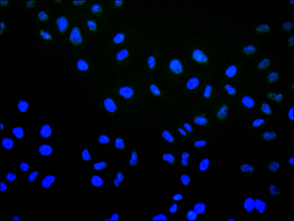 Immunofluorescence staining of HeLa cell with CSB-RA109932A0HU at 1:50 , counter-stained with DAPI. The cells were fixed in 4% formaldehyde, permeabilized using 0.2% Triton X-100 and blocked in 10% normal Goat Serum. The cells were then incubated with the antibody overnight at 4°C. The secondary antibody was Alexa Fluor 488-congugated AffiniPure Goat Anti-Rabbit IgG(H+L).