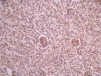 IHC image of CSB-RA109932A0HU diluted at 1:100 and staining in paraffin-embedded mouse kidney tissue performed on a Leica BondTM system. After dewaxing and hydration, antigen retrieval was mediated by high pressure in a citrate buffer (pH 6.0). Section was blocked with 10% normal goat serum 30min at RT. Then primary antibody (1% BSA) was incubated at 4°C overnight. The primary is detected by a Goat anti-rabbit polymer IgG labeled by HRP and visualized using 0.05% DAB.