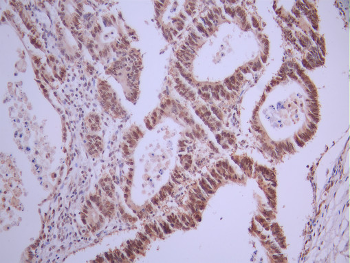 IHC image of CSB-RA109932A0HU diluted at 1:100 and staining in paraffin-embedded human colorectal cancer performed on a Leica BondTM system. After dewaxing and hydration, antigen retrieval was mediated by high pressure in a citrate buffer (pH 6.0). Section was blocked with 10% normal goat serum 30min at RT. Then primary antibody (1% BSA) was incubated at 4°C overnight. The primary is detected by a Goat anti-rabbit polymer IgG labeled by HRP and visualized using 0.05% DAB.