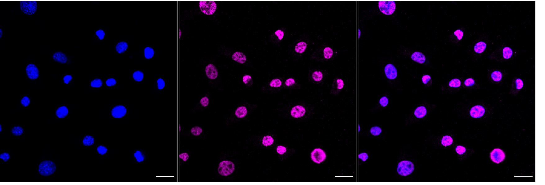 Immunocytochemical staining of C2C12 cells with A-kinase anchoring protein 8 antibody. Nuclei were stained blue with DAPI; A-kinase anchoring protein 8 was stained magenta with Alexa Fluor? 647. Images were taken using Leica stellaris 5. Protein abundance based on laser Intensity and smart gain: High. Scale bar, 20 μm.