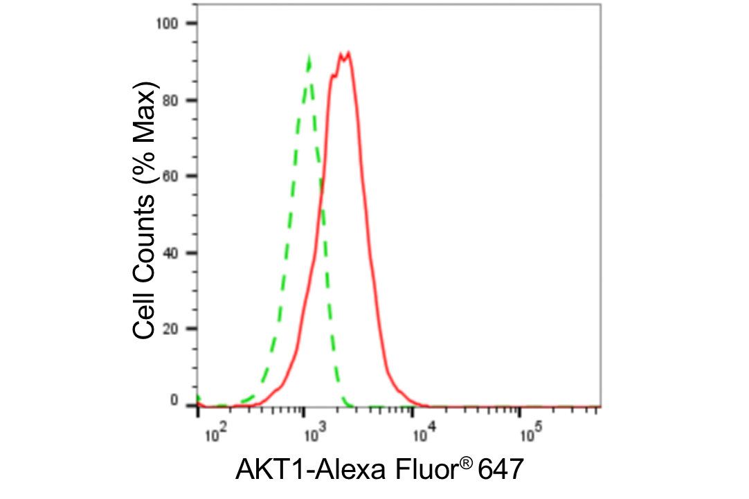 Flow cytometric analysis of AKT1 expression in HAP-1 cells using AKT1 antibody. Green, isotype control; red, AKT1.