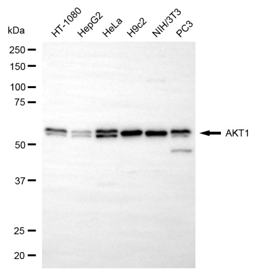 Western blotting analysis using AKT1 antibody. Total cell lysates (30 μg) from various cell lines were loaded and separated by SDS-PAGE. The blot was incubated with AKT1 antibody and HRP-conjugated goat anti-rabbit secondary antibody respectively.