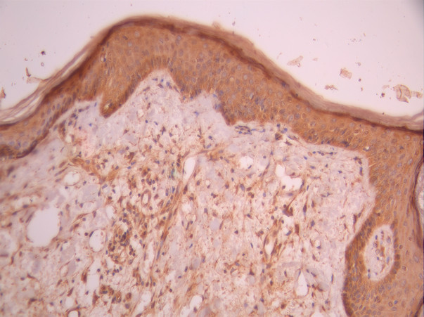 IHC image of CSB-RA131536A0HU diluted at 1:100 and staining in paraffin-embedded human skin tissue performed on a Leica BondTM system. After dewaxing and hydration, antigen retrieval was mediated by high pressure in a citrate buffer (pH 6.0). Section was blocked with 10% normal goat serum 30min at RT. Then primary antibody (1% BSA) was incubated at 4°C overnight. The primary is detected by a Goat anti-rabbit polymer IgG labeled by HRP and visualized using 0.05% DAB.