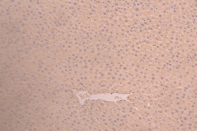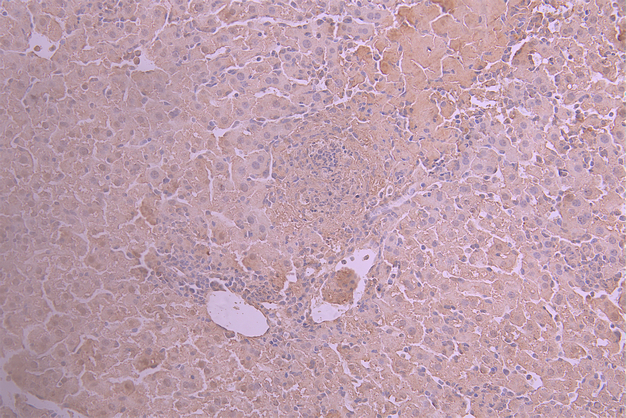 IHC image of CSB-RA001703MA1HU diluted at 1:50 and staining in paraffin-embedded rat liver tissue performed on a Leica BondTM system. After dewaxing and hydration, antigen retrieval was mediated by high pressure in a citrate buffer (pH 6.0). Section was blocked with 10% normal goat serum 30min at RT. Then primary antibody (1% BSA) was incubated at 4°C overnight. The primary is detected by a Anti-Human lgG, Fcy Fragment Specific labeled by HRP and visualized using 0.05% DAB.