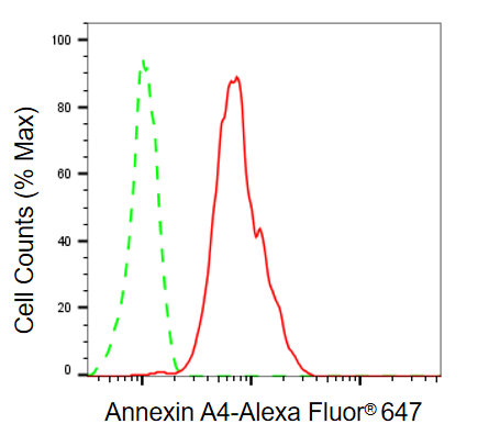 Flow cytometric analysis of annexin A4 expression in C2C12 cells using annexin A4 antibody. Green, isotype control; red, annexin A4.