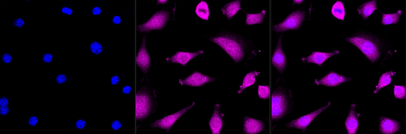 Immunocytochemical staining of C2C12 cells with Annexin A4 antibody. Nuclei were stained blue with DAPI; Annexin A4 was stained magenta with Alexa Fluor? 647. Images were taken using Leica stellaris 5. Protein abundance based on laser Intensity and Smart Gain: High. Scale bar, 20 μm.