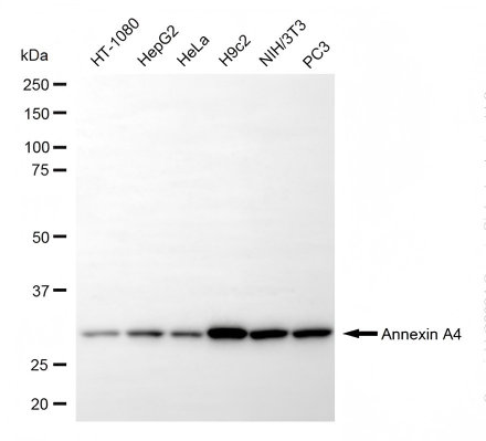 Western blotting analysis using annexin A4 antibody. Total cell lysates (30 μg) from various cell lines were loaded and separated by SDS-PAGE. The blot was incubated with annexin A4 antibody and HRP-conjugated goat anti-rabbit secondary antibody respectively.