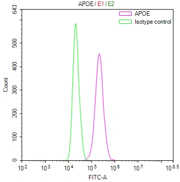 Overlay Peak curve showing HepG2 cells stained with CSB-RA001936MA1HU (red line) at 1:100. The cells were fixed in 4% formaldehyde and permeated by 0.2% TritonX-100 for 10min. Then 10% normal goat serum to block non-specific protein-protein interactions followed by the antibody (1ug/1*106cells) for 45min at 4℃. The secondary antibody used was FITC-conjugated Goat Anti-Mouse IgG(H+L) at 1:200 dilution for 35min at 4℃.Control antibody (green line) was mouse IgG2a (1ug/1*106cells) used under the same conditions. Acquisition of >10,000 events was performed.