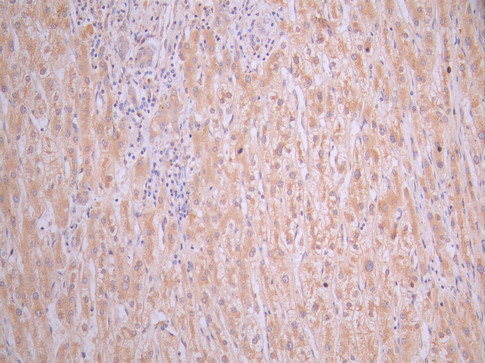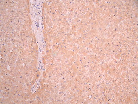 IHC image of CSB-RA001936MA1HU diluted at 1:50 and staining in paraffin-embedded human liver tissue performed on a Leica BondTM system. After dewaxing and hydration, antigen retrieval was mediated by high pressure in a citrate buffer (pH 6.0). Section was blocked with 10% normal goat serum 30min at RT. Then primary antibody (1% BSA) was incubated at 4°C overnight. The primary is detected by a Goat anti-mouse polymer IgG labeled by HRP and visualized using 0.05% DAB.