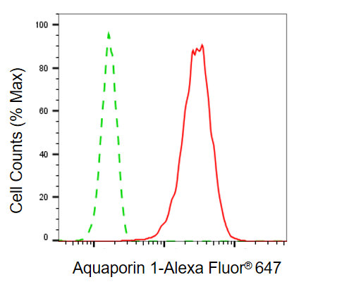 Flow cytometric analysis of aquaporin 1 expression in C2C12 cells using aquaporin 1 antibody. Green, isotype control; red, aquaporin 1.