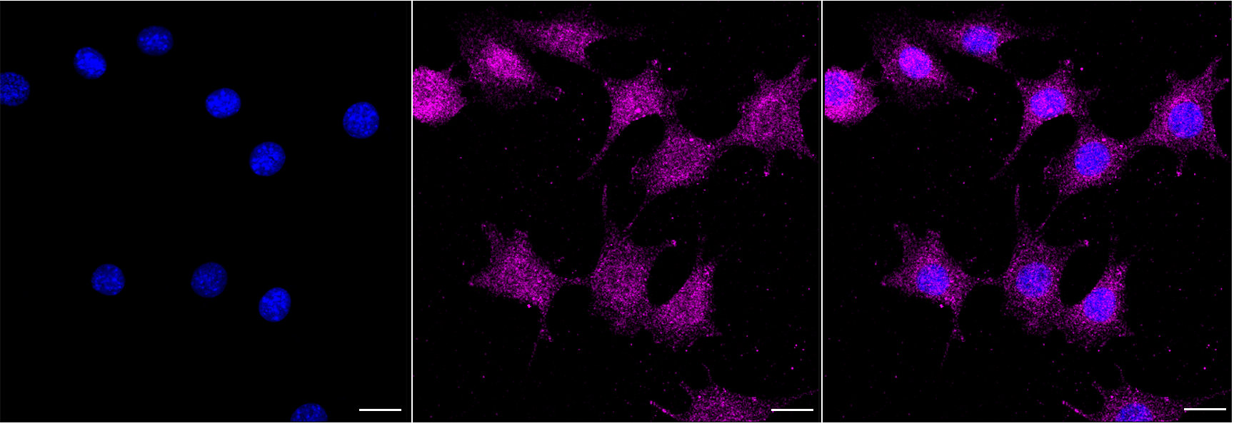 Immunocytochemical staining of C2C12 cells with Rho GTPase activating protein 5 antibody. Nuclei were stained blue with DAPI; Rho GTPase activating protein 5 was stained magenta with Alexa Fluor? 647. Images were taken using Leica stellaris 5. Protein abundance based on laser Intensity and smart gain: Medium. Scale bar, 20 μm.