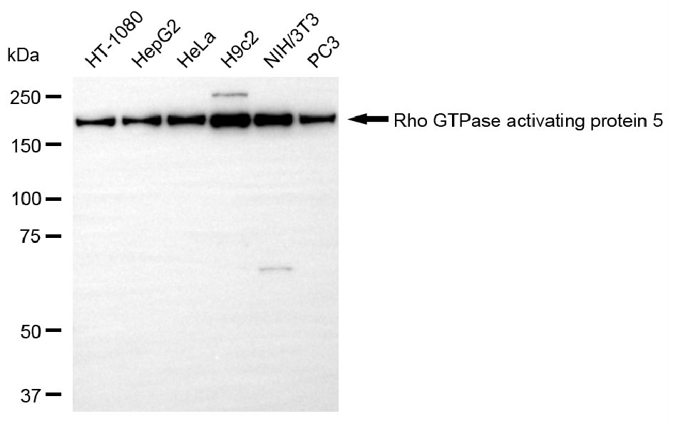 Western blotting analysis using Rho GTPase activating protein 5 antibody. Total cell lysates (30 μg) from various cell lines were loaded and separated by SDS-PAGE. The blot was incubated with Rho GTPase activating protein 5 antibody and HRP-conjugated goat anti-rabbit secondary antibody respectively.