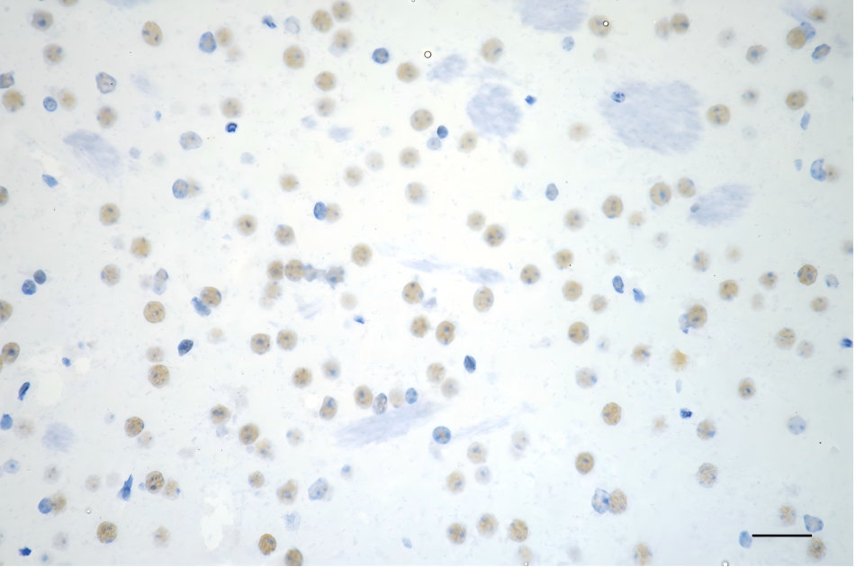 Immunohistochemistry was performed on paraffin-embedded mouse brain using ARID1A antibody. Antigen retrieval was done in sodium citrate buffer (pH 6.0). DAB was used for detection, with hematoxylin counterstaining. Images were acquired using a Nikon Ci-L Plus microscope (40× objective). Scale bar: 25 μm.
