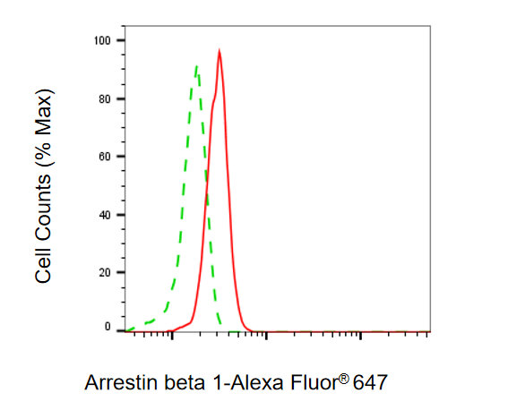 Flow cytometric analysis of Arrestin beta 1 expression in HepG2 cells using Arrestin beta 1 antibody. Green, isotype control; red, Arrestin beta 1.