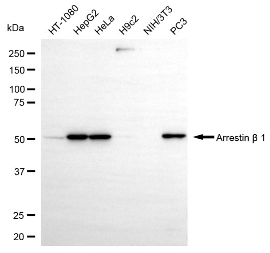 Western blotting analysis using arrestin beta 1 antibody. Total cell lysates (30 μg) from various cell lines were loaded and separated by SDS-PAGE. The blot was incubated with arrestin beta 1 antibody and HRP-conjugated goat anti-rabbit secondary antibody respectively.