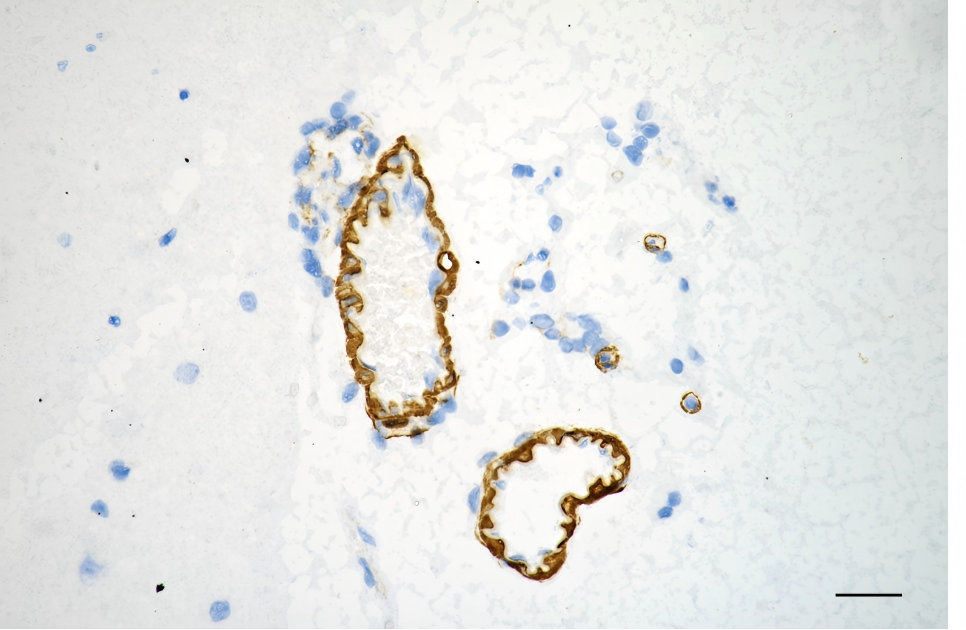 Immunohistochemistry was performed on paraffin-embedded mouse brain using phospho-beta arrestin 1 (S412) antibody. Antigen retrieval was done in sodium citrate buffer (pH 6.0). DAB was used for detection, with hematoxylin counterstaining. Images were acquired using a Nikon Ci-L Plus microscope (40× objective). Scale bar: 25 μm.