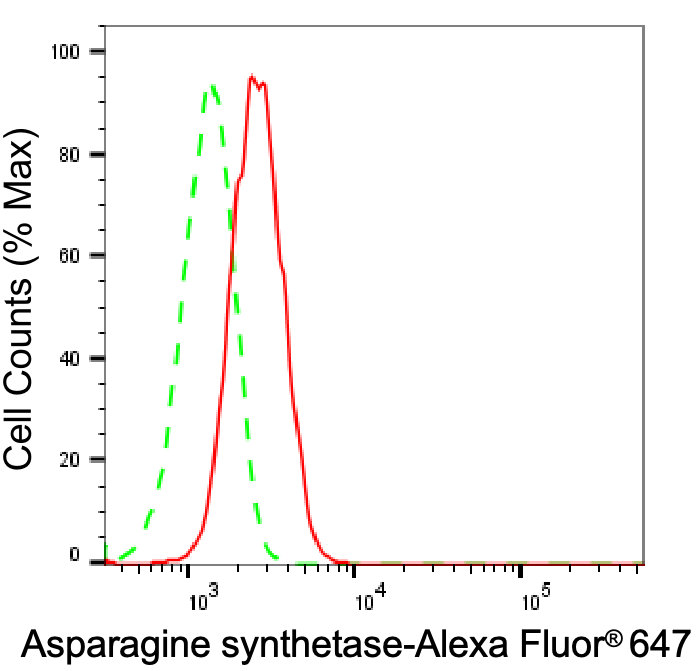 Flow cytometric analysis of Asparagine synthetase expression in HAP-1 cells using Asparagine synthetase antibody. Green, isotype control; red, Asparagine synthetase.