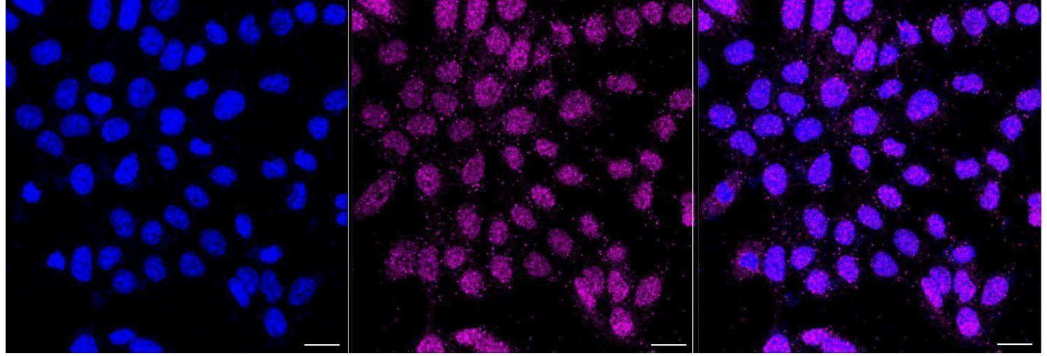 Immunocytochemical staining of HAP-1 cells with Asparagine synthetase antibody. Nuclei were stained blue with DAPI; Asparagine synthetase was stained magenta with Alexa Fluor? 647. Images were taken using Leica stellaris 5. Protein abundance based on laser Intensity and smart gain: Medium. Scale bar, 20 μm.