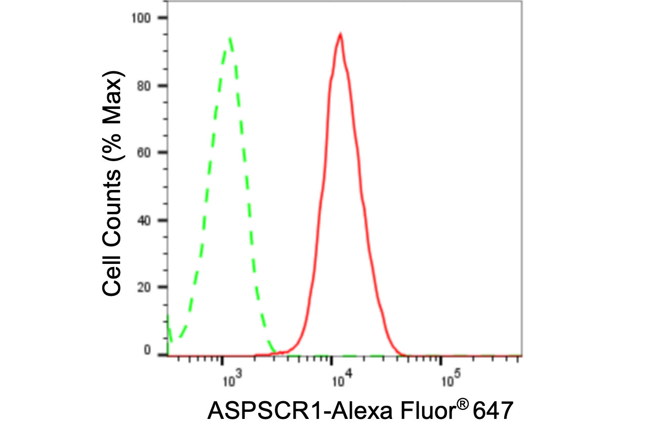 Flow cytometric analysis of ASPSCR1 expression in C2C12 cells using ASPSCR1 antibody. Green, isotype control; red, ASPSCR1.