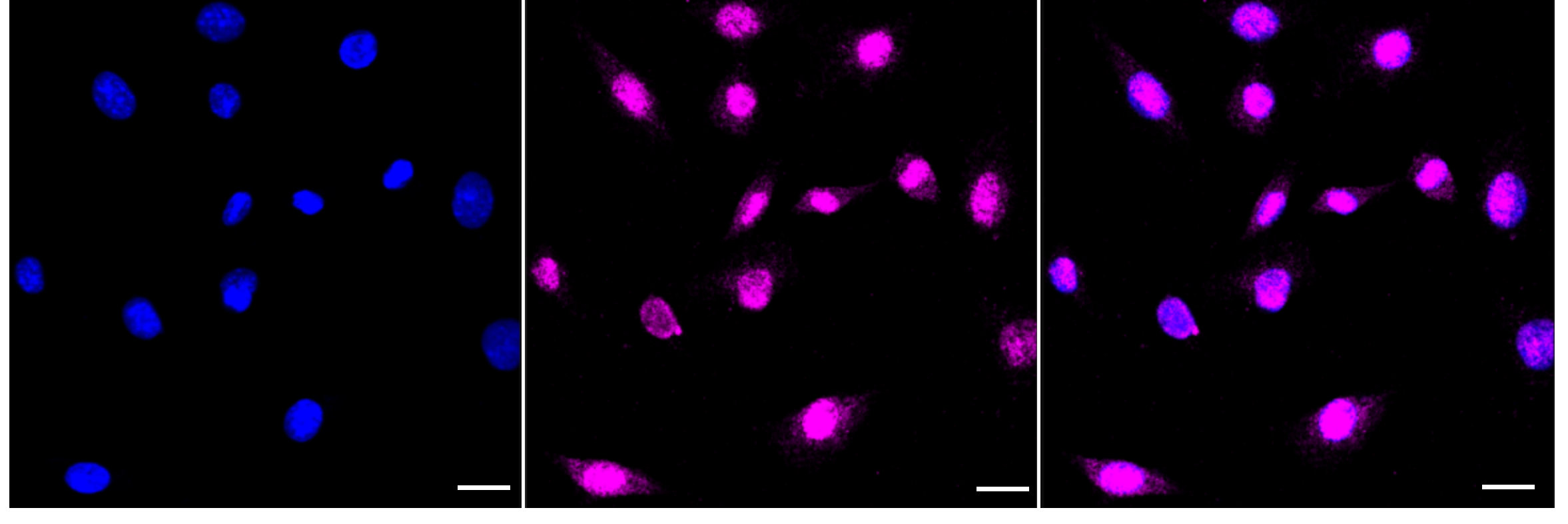 Immunocytochemical staining of C2C12 cells with ASPSCR1 antibody. Nuclei were stained blue with DAPI; ASPSCR1 was stained magenta with Alexa Fluor? 647. Images were taken using Leica stellaris 5. Protein abundance based on laser Intensity and smart gain: Medium. Scale bar: 20 μm.